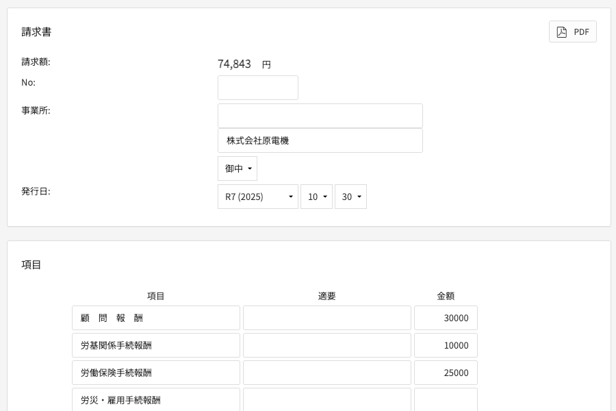 請求金額入力時に、消費税や源泉所得税を自動で計算。