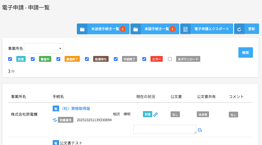 「送信済」「受付完了」「公文書取得済」など、状態別に表示。