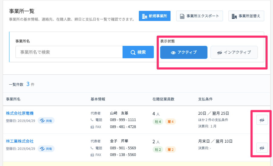事業所ごとに「アクティブ」または「インアクティブ」の状態を設定できるようになりました。